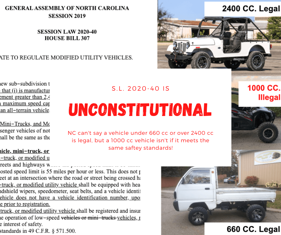The law canโt exclude modified utility vehicles from 661 cc to 2399 cc, such as a 1000 cc SXS, if vehicles in this range have the same safety requirements as the vehicles below 660 cc and above 2400 cc. The 14th Amendment allows for equal protection under the law and regulates interstate commerce among many other areas. Corporate interest has been able to manipulate this law to their benefit and it appears NC legislatures havenโt done their due diligence, Iโm assuming as of this point in time.