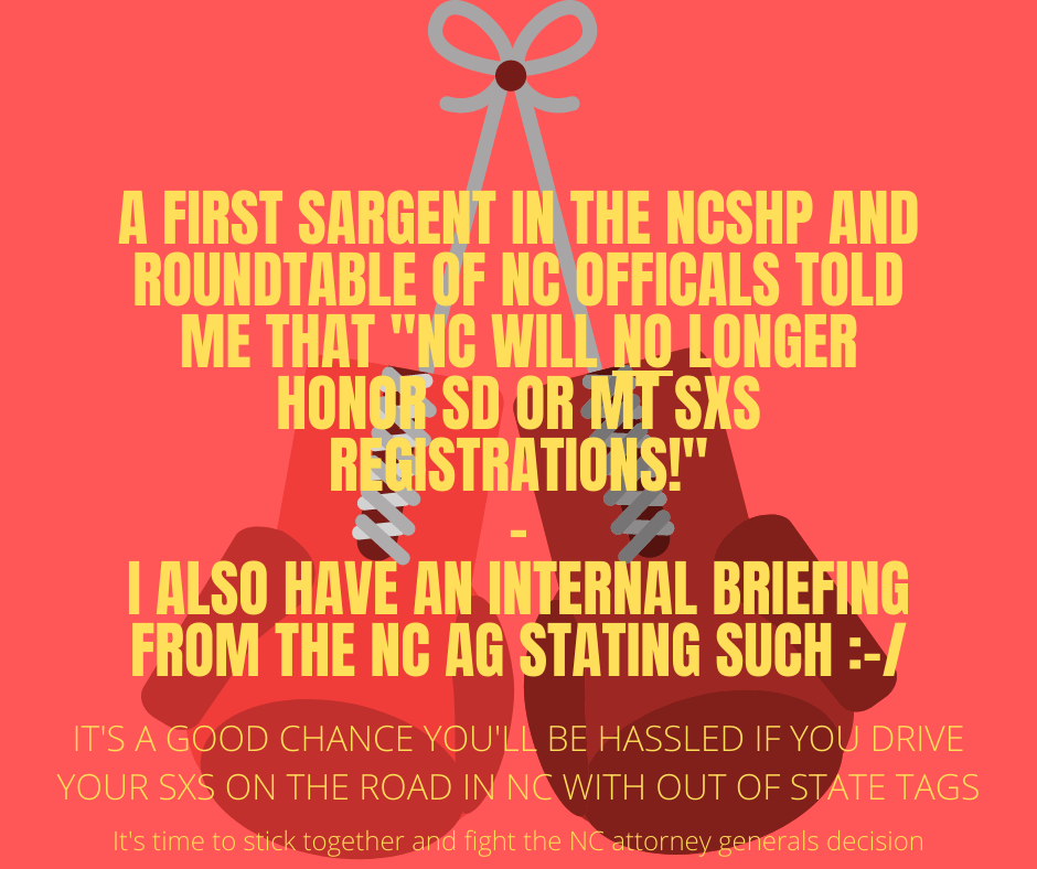 From that meeting, basically, the SHP said NC will also no longer honor South Dakota (SD) Registrations for SXS/UTVs operating in NC. The First Sargent of the NCSHP has made it a priority to inform the other districts in NC know that NC will not honor SD tags as well. This is why we should stick together and get NC to legalize SXS for road use.